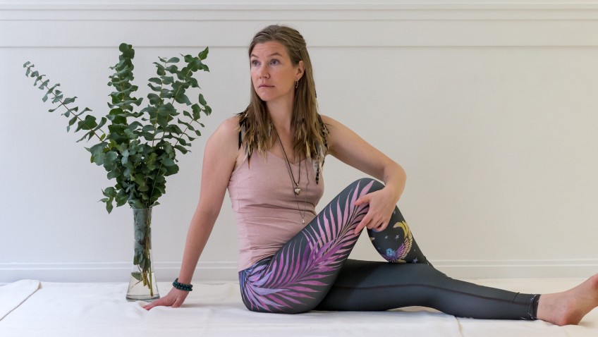 Fokus på vridningar, sträcka ut över säte och att få några övningar med fokus på balans och styrka genom solhälsningar. Video tillgänglig efter köp.